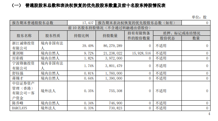 其中,董剑刚拟通过大宗交易方式减持不超过275.3621万股,占公司总股本的1.2602%;宁波锋驰投资有限公司拟通过集中竞价交易及大宗交易方式减持不超过380.1479万股,占公司总股本的1.7398%。