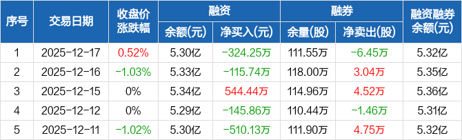 郑州银行:融资净偿还324.25万元,融资余额5.3亿元(12-17)