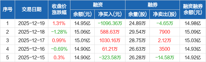 长城证券:融资净偿还1096.36万元,融资余额14.95亿元(12-19)