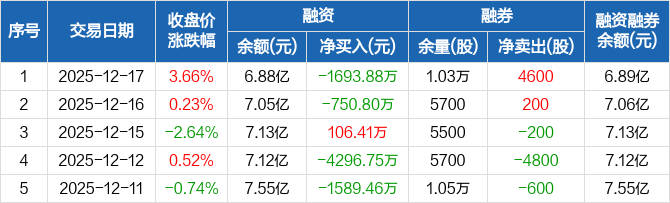 恒铭达:融资净偿还1693.88万元,融资余额6.88亿元(12-17)