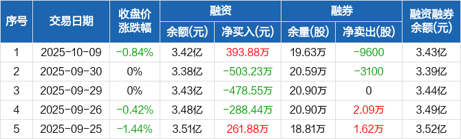 融资方面,当日融资买入1469.35万元,融资偿还1075.47万元,融资净买入393.88万元。融券方面,融券卖出0股,融券偿还9600股,融券余量19.63万股,融券余额92.65万元。融资融券余额合计3.43亿元。