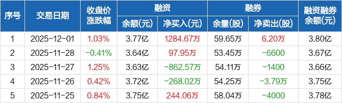 青岛银行融资融券信息显示,2025年12月1日融资净买入1284.67万元;融资余额3.77亿元,较前一日增加3.53%。