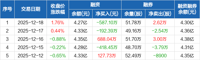 青岛银行:融资净偿还587.1万元,融资余额4.27亿元(12-18)