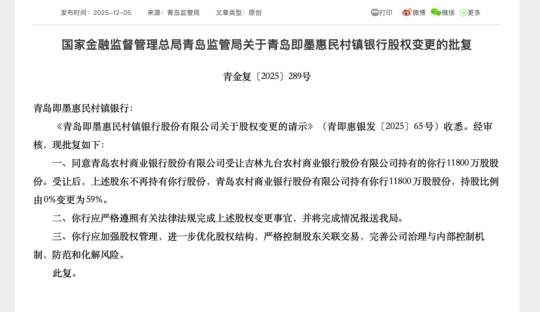 青岛农商行对青岛即墨惠民村镇银行持股比例由0%变更为59%