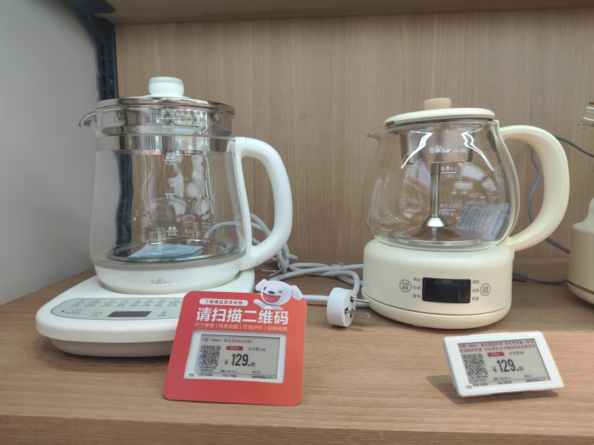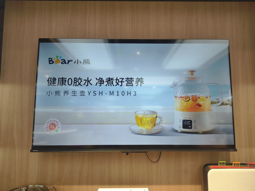 图:小熊电器养生壶专柜屏幕广告。周良成/摄
