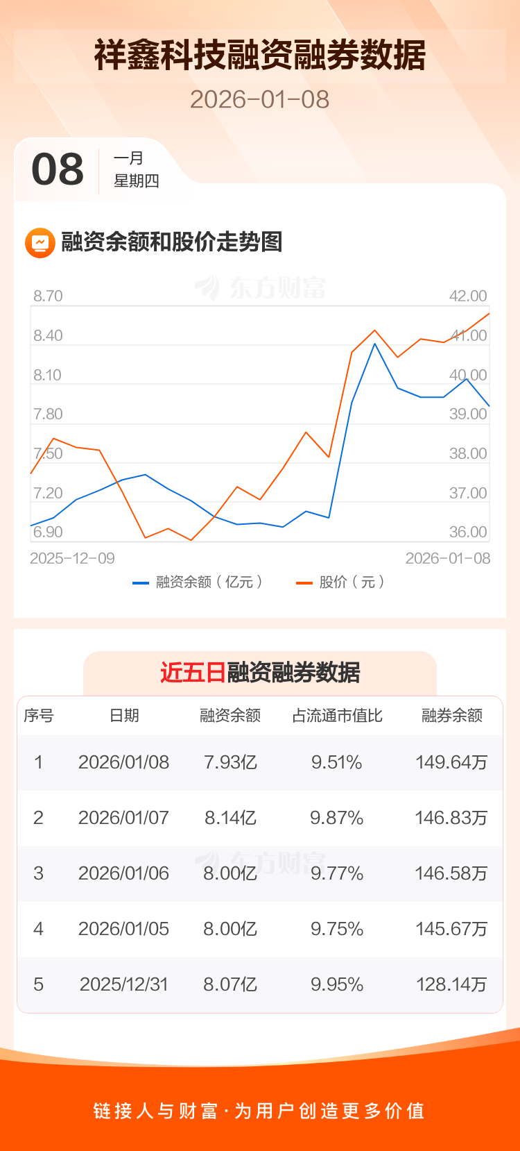 交易所最新数据显示,祥鑫科技于2026年1月8日获融资买入4170.99万元,融资偿还6342.54万元,当日融资净偿还2171.54万元。目前,该股融资余额7.93亿,占流通市值比例为9.51%。