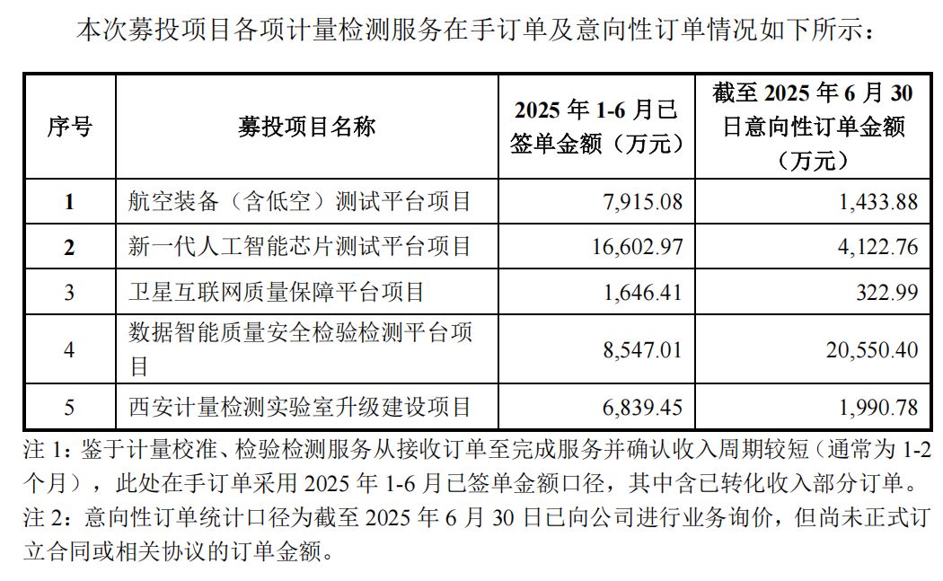 “相较于本次募投项目建成后可新增营业收入,新一代人工智能芯片测试平台项目、数据智能质量安全检验检测平台项目、西安计量检测实验室升级建设项目均已有相对充足的订单储备,其2025年上半年已签单金额及截至报告期末意向性订单金额较大,足以覆盖项目建成后产能。航空装备(含低空)测试平台项目、卫星互联网质量保障平台项目目前订单储备规模相对较小,系发行人正在逐步导入相关领域客户,目前订单量正处于持续增长阶段。”广电计量表示。