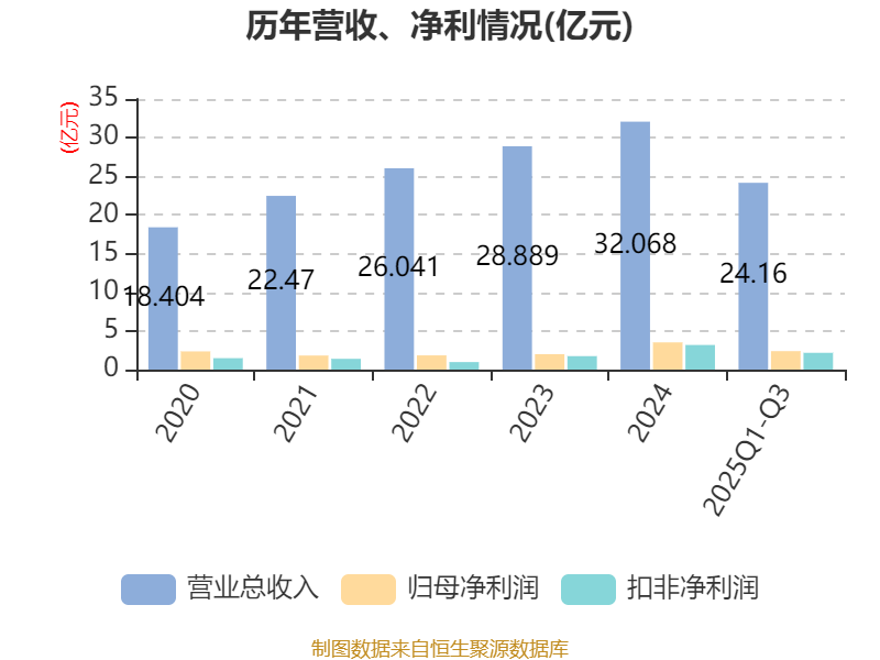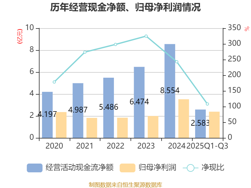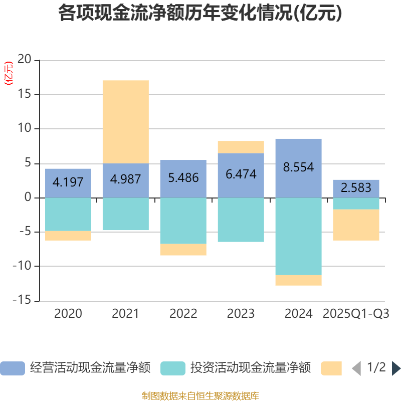 2025年前三季度,公司经营活动现金流净额为2.58亿元,同比下降23.42%;筹资活动现金流净额-4.53亿元,同比减少4.47亿元;投资活动现金流净额-1.72亿元,上年同期为-8.27亿元。