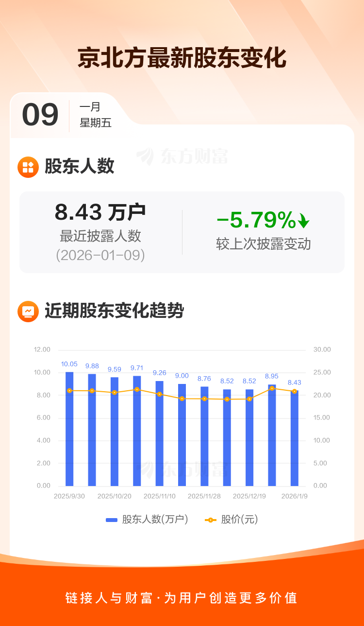 京北方最新披露数据显示,截至1月9日公司股东户数为8.43万户,较上期(2025年12月31日)减少5178户,降幅为5.79%。户均持有流通股数量由上期的9427股上升至1.00万股,户均持股金额由上期的20.30万元增加至20.88万元。