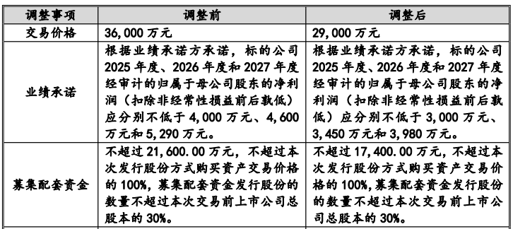 根据业绩承诺方承诺,标的公司2025年度、2026年度和2027年度经审计的归属于母公司股东的净利润(扣除非经常性损益前后孰低) 应分别不低于4000 万元、4600万元和5290万元。调整后为应不低于3000万元、3450万元和3980万元。本次业绩承诺调整前后,各期业绩承诺金额均高于采取收益法评估预测的净利润。