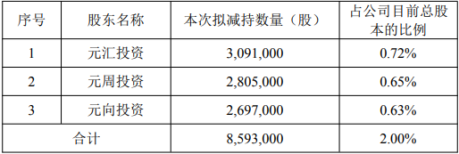 持有公司股份11,424,998股(占公司总股本的2.66%)的股东元周投资,拟自本公告披露之日起15个交易日后的3个月内通过集中竞价或大宗交易方式,合计减持公司股份不超过2,805,000股(占公司总股本比例0.65%)。