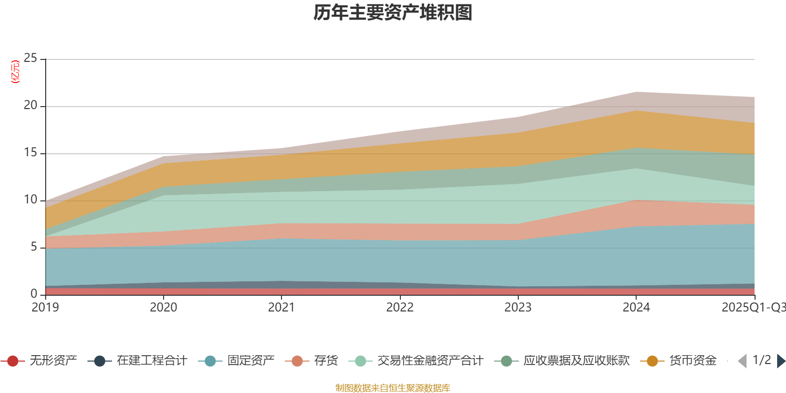 资产重大变化方面,截至2025年三季度末,公司交易性金融资产合计较上年末减少40.02%,占公司总资产比重下降5.94个百分点;应收票据及应收账款较上年末增加52.15%,占公司总资产比重上升5.73个百分点;存货较上年末减少28.72%,占公司总资产比重下降3.54个百分点;预付款项较上年末增加178.08%,占公司总资产比重上升2.61个百分点。