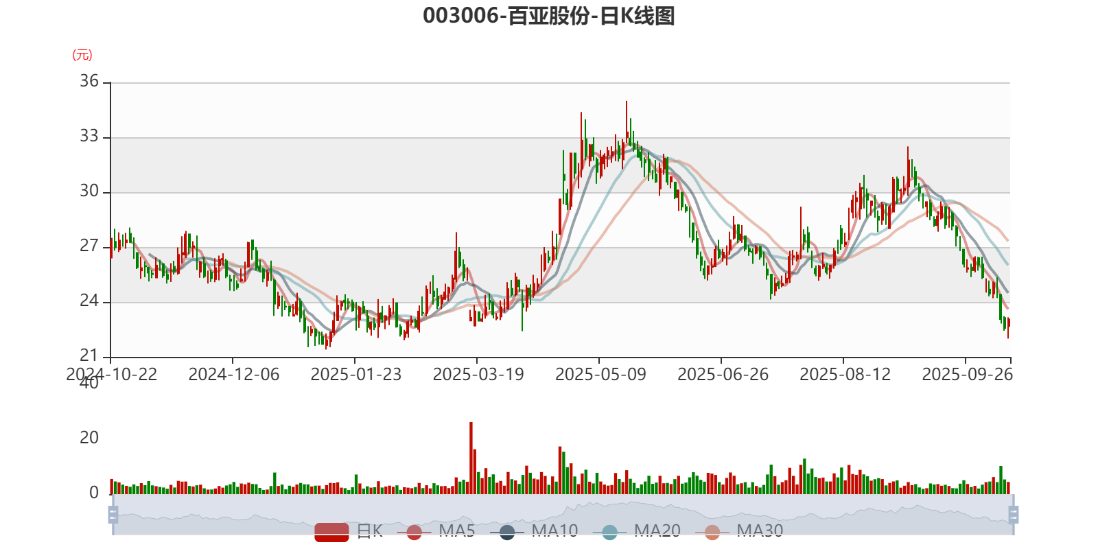 以10月21日收盘价计算,百亚股份目前市盈率(TTM)约为33.72倍,市净率(LF)约6.74倍,市销率(TTM)约2.79倍。