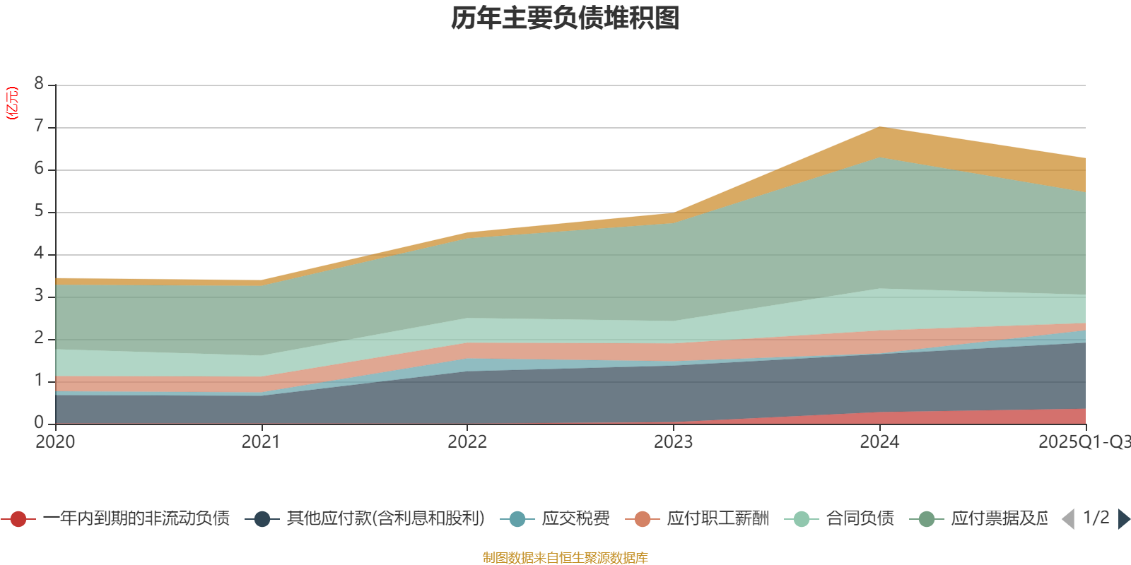 负债重大变化方面,截至2025年三季度末,公司应付票据及应付账款较上年末减少21.87%,占公司总资产比重下降2.85个百分点;应付职工薪酬较上年末减少68.66%,占公司总资产比重下降1.72个百分点;合同负债较上年末减少32.52%,占公司总资产比重下降1.41个百分点;应交税费较上年末增加1761.21%,占公司总资产比重上升1.33个百分点。