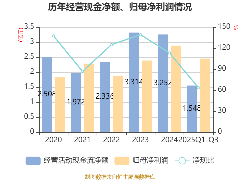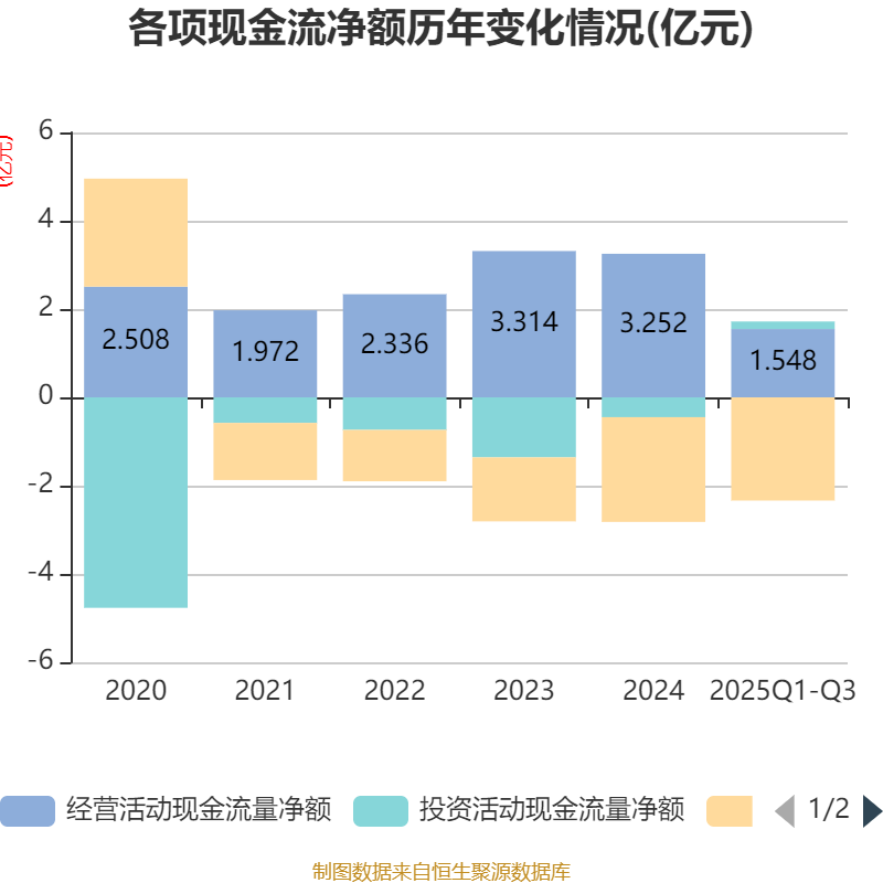 2025年前三季度,公司经营活动现金流净额为1.55亿元,同比下降30.28%;筹资活动现金流净额-2.34亿元,同比增加166.93万元;投资活动现金流净额1701.9万元,上年同期为-1374.54万元。