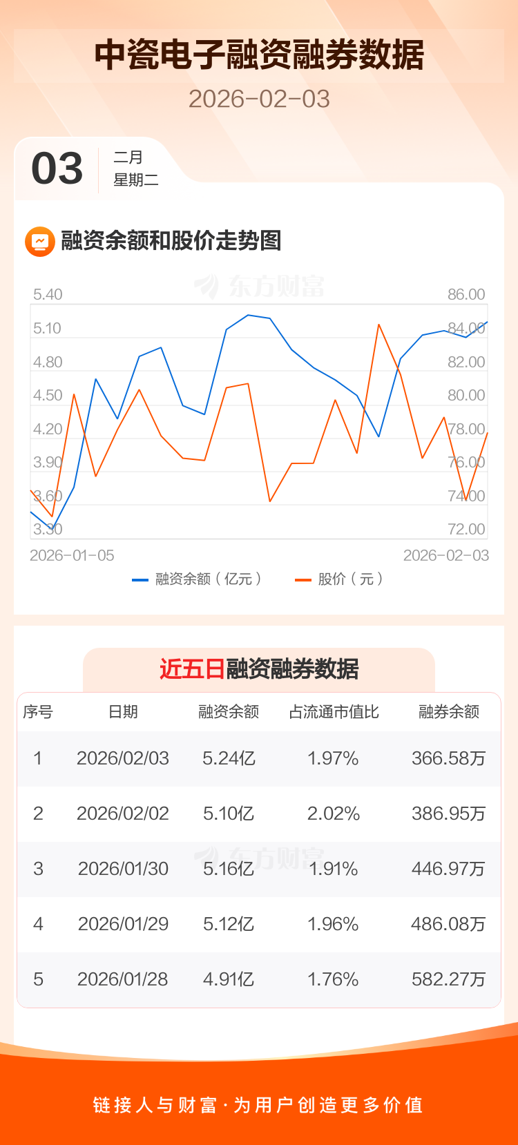 交易所最新数据显示,中瓷电子于2026年2月3日获融资买入9031.04万元,融资偿还7585.19万元,当日融资净买入1445.85万元。目前,该股融资余额5.24亿,占流通市值比例为1.97%。