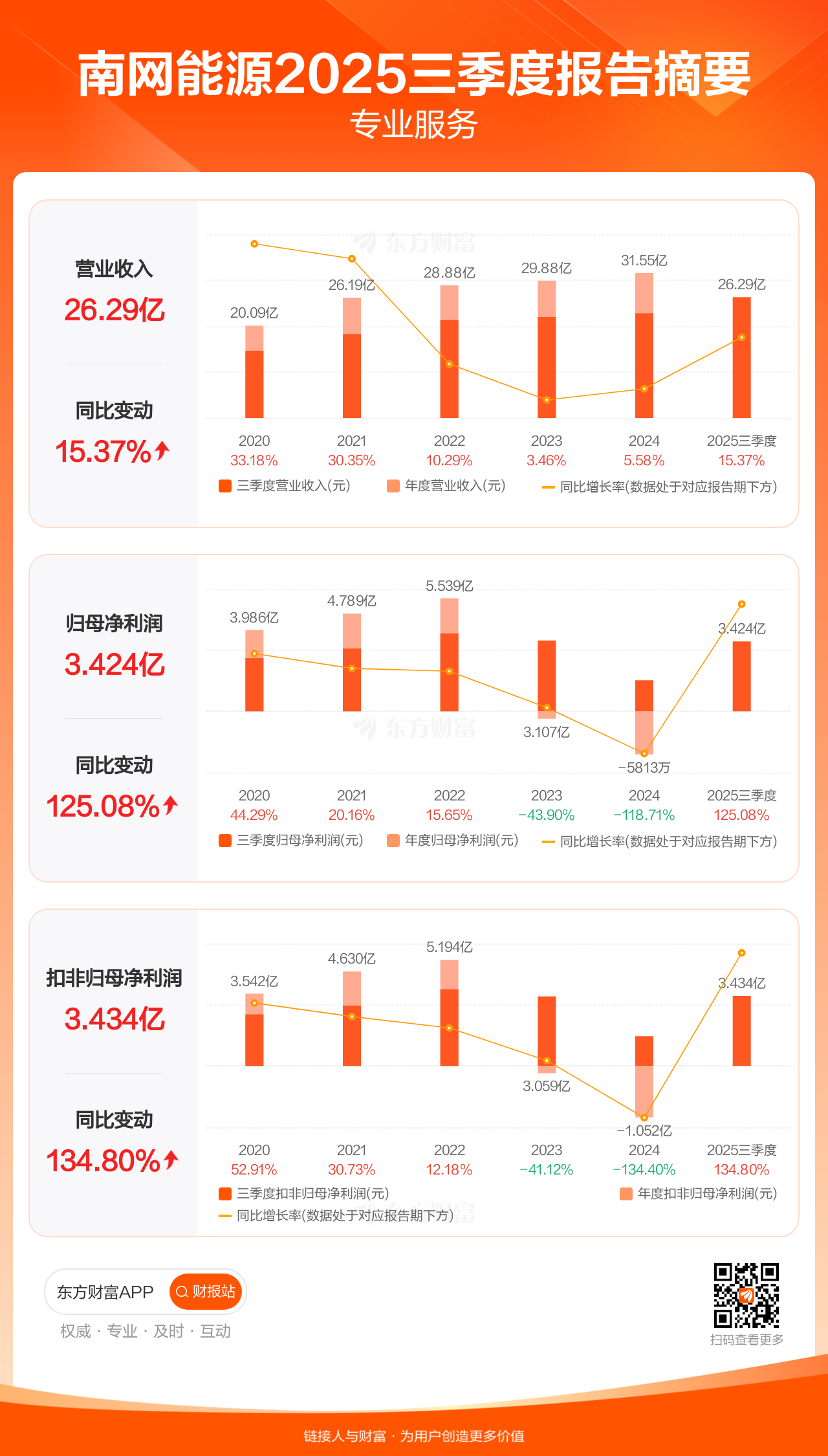 南网能源10月28日发布2025年三季报显示,公司前三季实现营业收入26.29亿元,同比增长15.37%;归母净利润3.42亿元,同比增长125.08%;扣非归母净利润3.43亿元,同比增长134.80%。