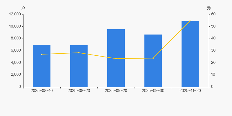 2025年8月10日至今,公司股东户数显著大幅增长,区间涨幅达56.19%。2025年8月10日至2025年11月20日区间股价上涨102.88%。