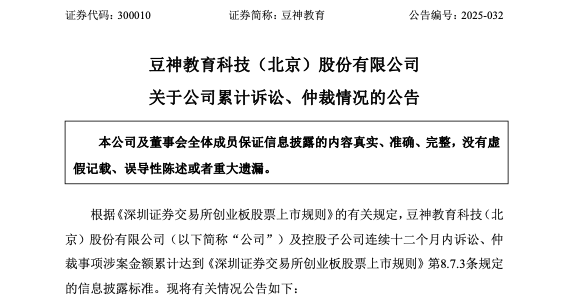 9月25日晚间,豆神教育(300010)发布公告,截至公告日,公司及控股子公司累计诉讼、仲裁事项涉案金额达到2.72亿元,占公司2024年度经审计的归母净资产的16.78%。