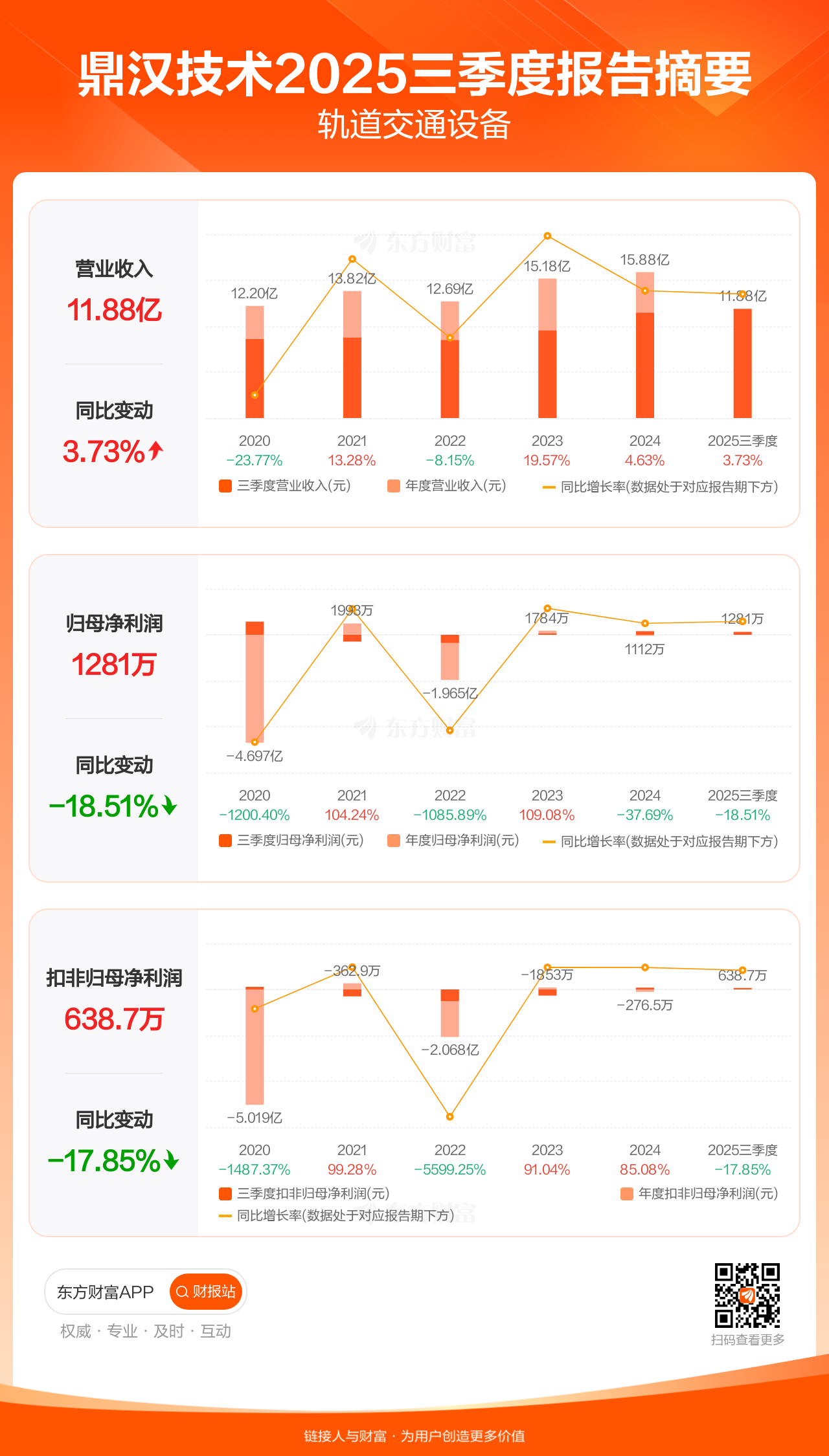 鼎汉技术10月30日发布2025年三季报显示,公司前三季实现营业收入11.88亿元,同比增长3.73%;归母净利润1280.90万元,同比下滑18.51%;扣非归母净利润638.73万元,同比下滑17.85%。