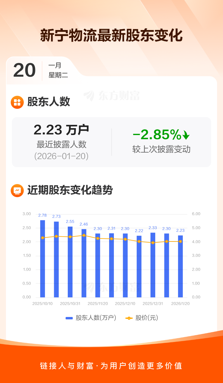 新宁物流最新披露数据显示,截至1月20日公司股东户数为2.23万户,较上期(2026年1月9日)减少655户,降幅为2.85%。户均持有流通股数量由上期的1.94万股上升至2.00万股,户均持股金额由上期的7.82万元增加至8.05万元。