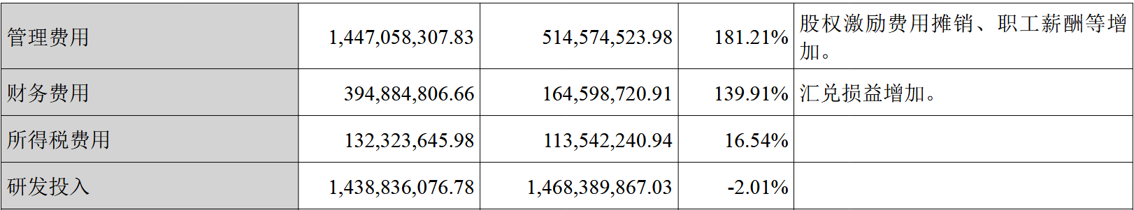 同时,公司管理费用暴涨181.21%至14.47亿元,财务费用更是增长139.91%,增速均高于营收增幅。这或说明,公司成本控制环节存在系统性短板。