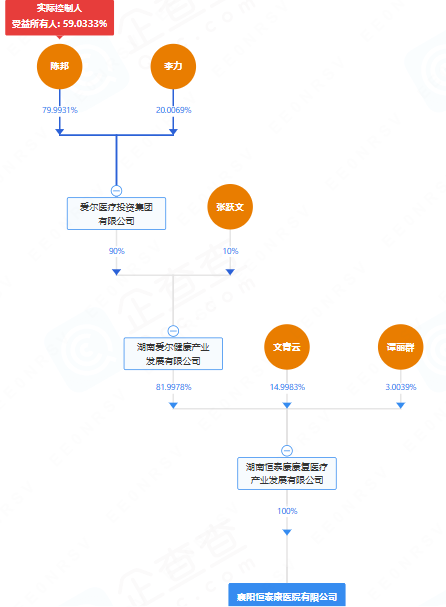 企查查数据显示,襄阳恒泰康由湖南恒泰康康复医疗产业发展有限公司100%控股;而湖南爱尔健康产业发展有限公司又持有湖南恒泰康康复医疗产业发展有限公司81.9978%的股权;在其之上,爱尔医疗投资集团通过持有湖南爱尔健康产业发展有限公司90%的股权,实现了对襄阳恒泰康的间接控股。