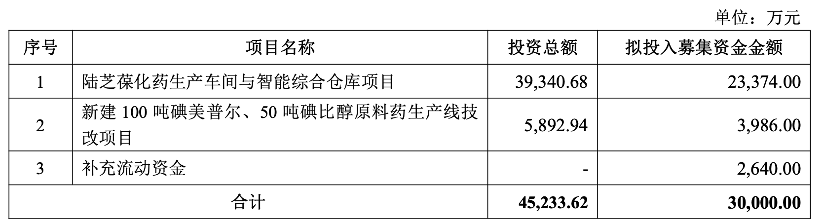 公告显示,此次发行拟募集不超过3亿元,募集资金用于以下用途:陆芝葆化药生产车间与智能综合仓库项目,总投资约3.93亿元,拟投入募集资金约2.34亿元;新建100吨碘美普尔、50吨碘比醇原料药生产线技改项目,总投资5892.94万元,拟投入募集资金3986万元;补充流动资金项目拟投入募集资金2640万元。