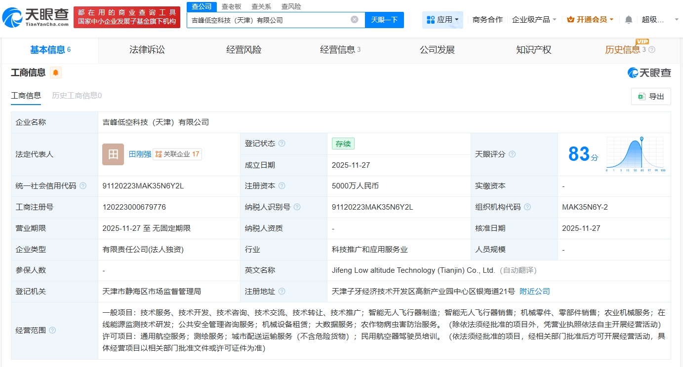 吉峰科技在天津成立低空科技公司