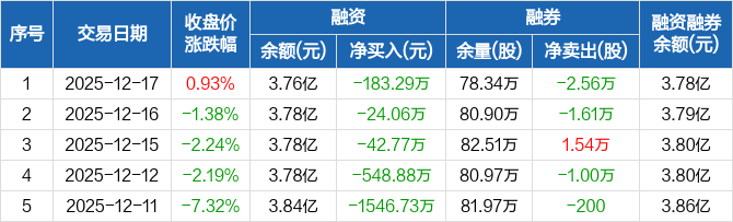 融资方面,当日融资买入547.93万元,融资偿还731.21万元,融资净偿还183.29万元,连续8日净偿还累计5377.43万元。融券方面,融券卖出300股,融券偿还2.59万股,融券余量78.34万股,融券余额170万元。融资融券余额合计3.78亿元。