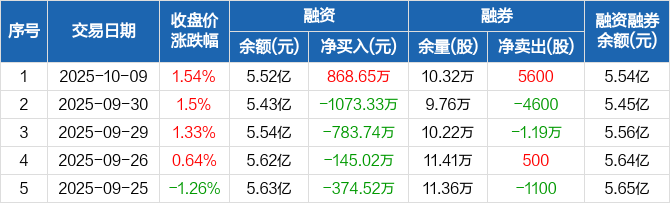 钢研高纳融资融券信息显示,2025年10月9日融资净买入868.65万元;融资余额5.52亿元,较前一日增加1.6%