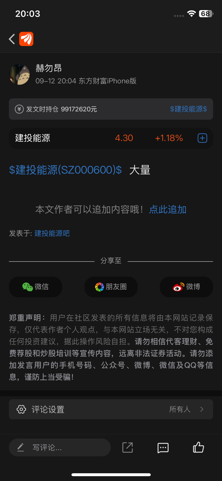 温馨提示: 1.根据《证券法》规定,禁止编造、传播虚假信息或者误导性信息,扰乱证券市场;2.用户在本社区发表的所有资料、言论等仅代表个人观点,与本网站立场无关,不对您构成任何投资建议。用户应基于自己的独立判断,自行决定证券投资并承担相应风险。《东方财富社区管理规定》