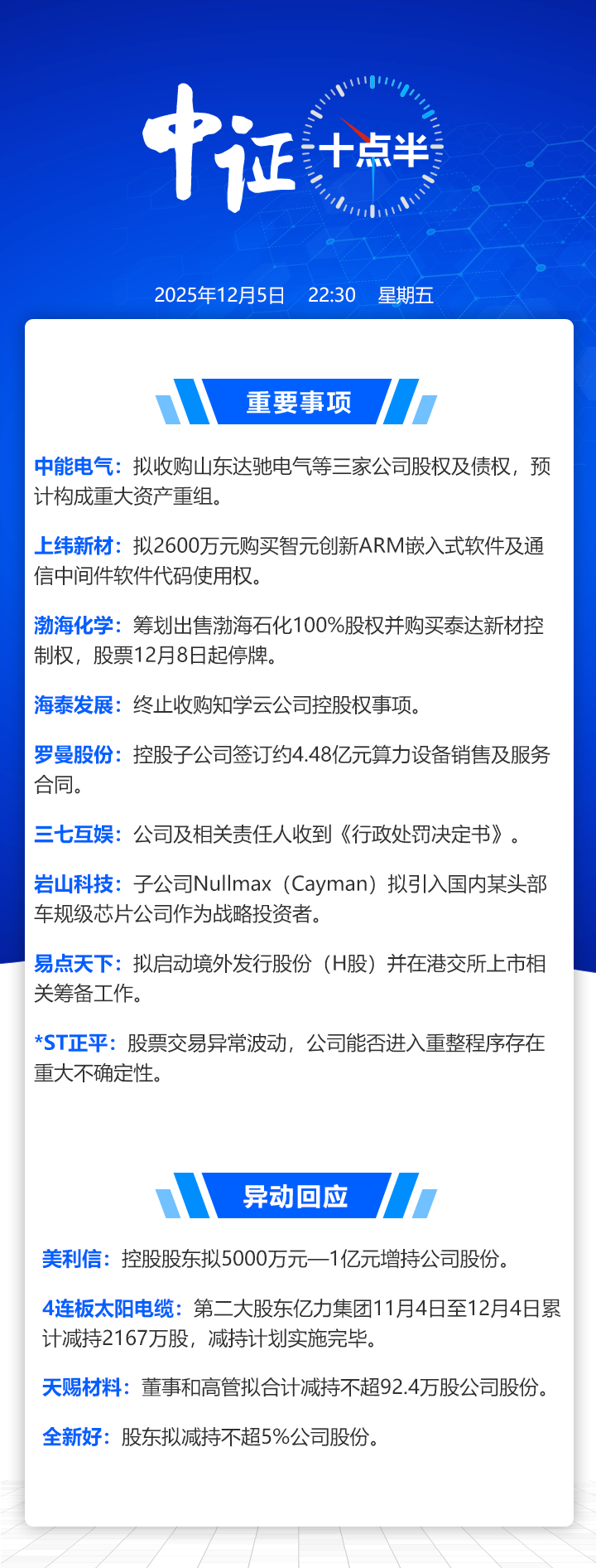 【中证十点半】中能电气拟重大资产重组;海泰发展终止收购知学云控股权;易点天下拟赴港上市