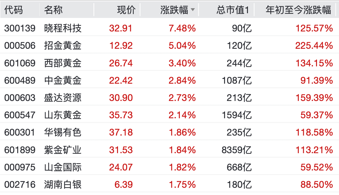 上午,A股贵金属概念股拉升,晓程科技涨超7%,招金黄金涨5%,西部黄金、盛达资源、中金黄金、山东黄金等跟涨。
