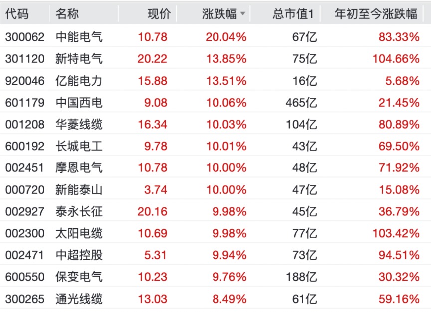 个股掀“涨停潮”,中能电气录得20cm涨停,中国西电、华菱线缆、摩恩电气、长城电工、新能泰山、泰永长征、太阳电缆等多股涨停。