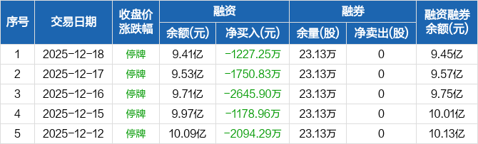 融资方面,当日融资买入0元,融资偿还1227.25万元,融资净偿还1227.25万元,连续5日净偿还累计8897.23万元。融券方面,融券卖出0股,融券偿还0股,融券余量23.13万股,融券余额425.13万元。融资融券余额合计9.45亿元。