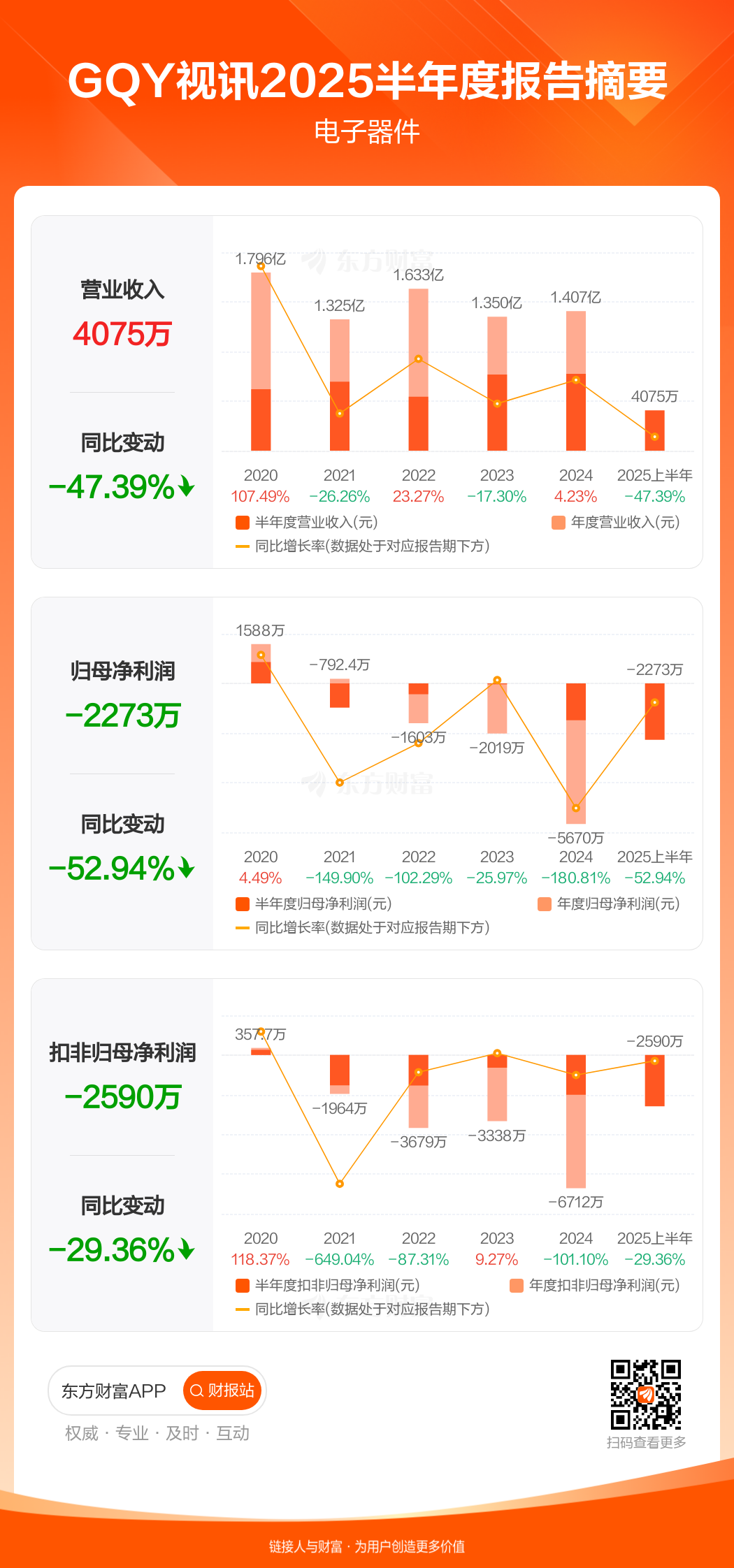 GQY视讯发布2025半年度报告显示,公司上半年实现营业收入4074.68万元,同比下滑47.39%;归母净利润-2272.64万元,上年同期-1485.93万元;扣非归母净利润-2590.32万元,上年同期-2002.38万元。