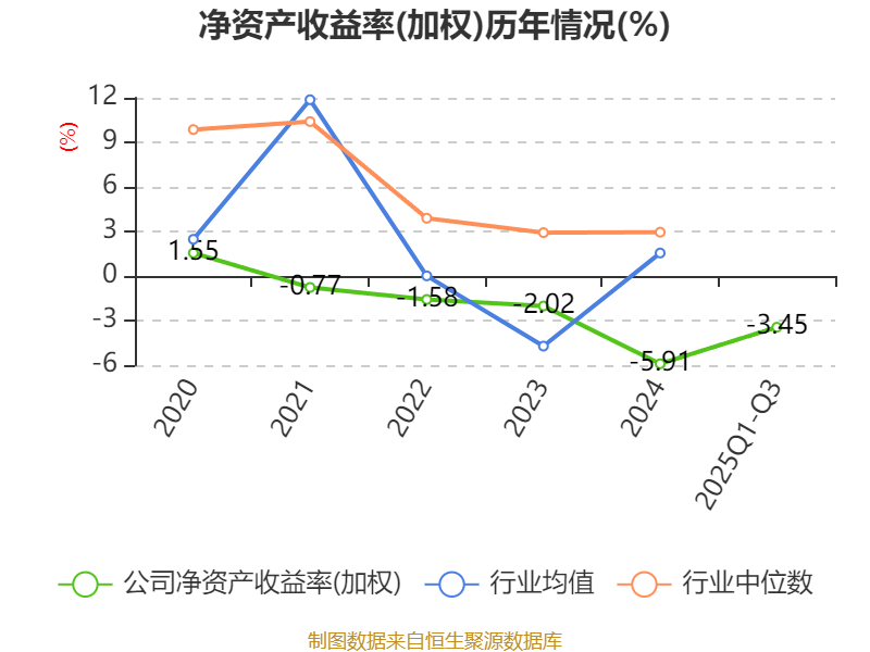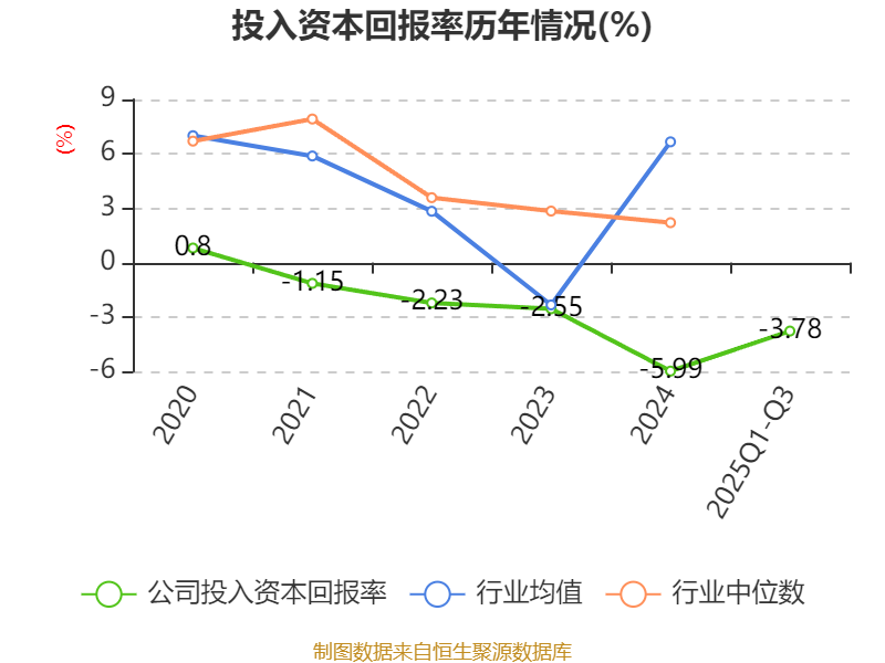 盈利能力方面, 2025年前三季度公司加权平均净资产收益率为-3.45%,同比下降0.91个百分点。公司2025年前三季度投入资本回报率为-3.78%,较上年同期下降1.05个百分点。