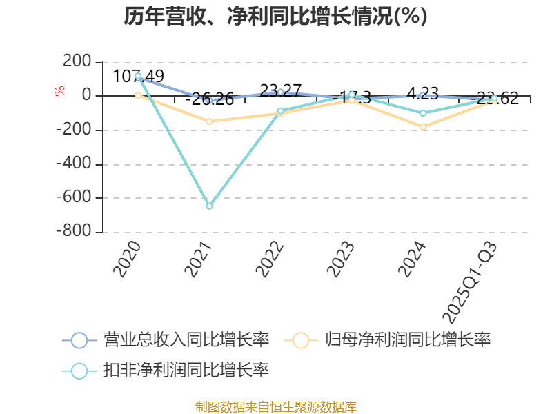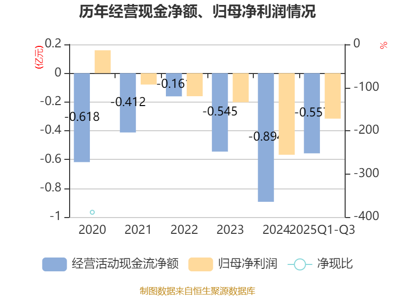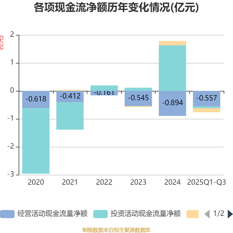 2025年前三季度,公司经营活动现金流净额为-5572.86万元,同比增加3239.68万元;筹资活动现金流净额-1462.59万元,同比减少1359.58万元;投资活动现金流净额-609.38万元,上年同期为2013.44万元。