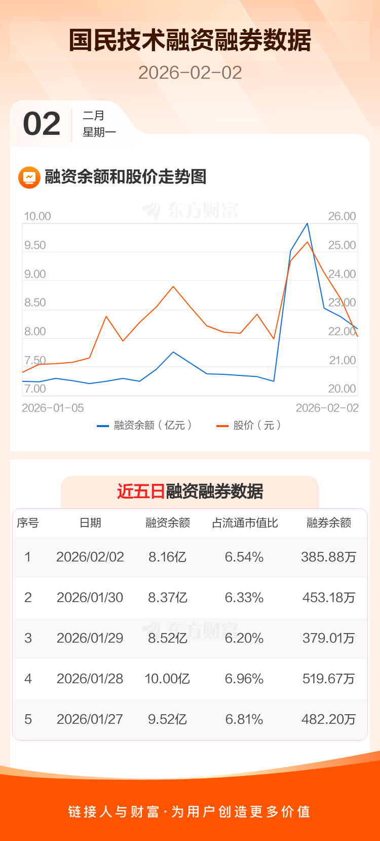 交易所最新数据显示,国民技术于2026年2月2日获融资买入6698.57万元,融资偿还8781.95万元,当日融资净偿还2083.38万元。目前,该股融资余额8.16亿,占流通市值比例为6.54%。