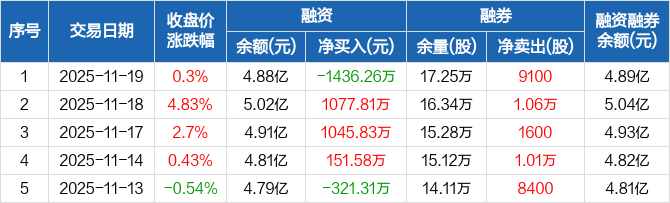 荃银高科:融资净偿还1436.26万元,融资余额4.88亿元(11-19)