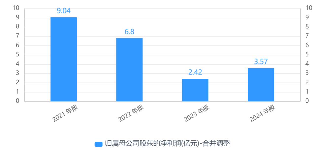 纵观近年业绩,长信科技的净利润呈现出显著的波动态势。去年虽同比有所回暖,但仅为三年前水平的四成不到。2021年至2024年,公司归母净利润分别为9.04亿元、6.8亿元、2.42亿元、3.57亿元。