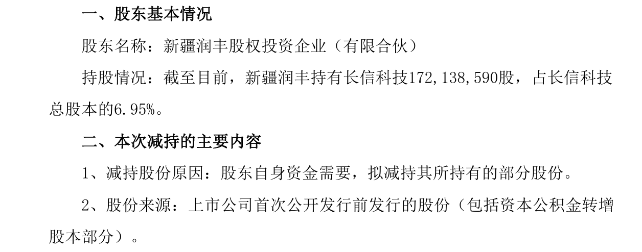 截至目前,新疆润丰持有长信科技1.7亿股,占长信科技总股本的6.95%,为公司第二大股东,股份来源为上市公司首次公开发行前发行的股份。