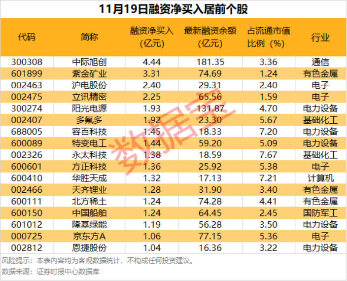 具体到个股,11月19日获融资净买入千万元以上的有359只,其中17只融资净买入额超1亿元。中际旭创融资净买入额居首,当日净买入4.44亿元;其次是紫金矿业、沪电股份,融资净买入金额分别为3.31亿元、2.40亿元;融资净买入金额居前的还有立讯精密、阳光电源、多氟多等。
