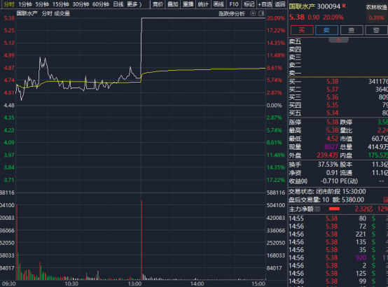 今日午后,水产品概念股大幅异动,国联水产、獐子岛、大湖股份等直线涨停。截至收盘,水产品板块指数涨幅超过9%,个股几乎全线涨停。