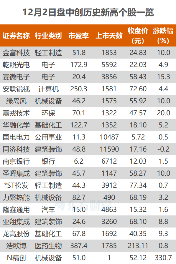 12月2日,A股三大指数今日集体回调,截止收盘,沪指跌0.42%,收报3897.71点;深证成指跌0.68%,收报13056.70点;创业板指跌0.69%,收报3071.15点。东方财富Choice数据显示,今日有18只个股盘中股价创历史新高,分别为乾照光电、赛微电子等。