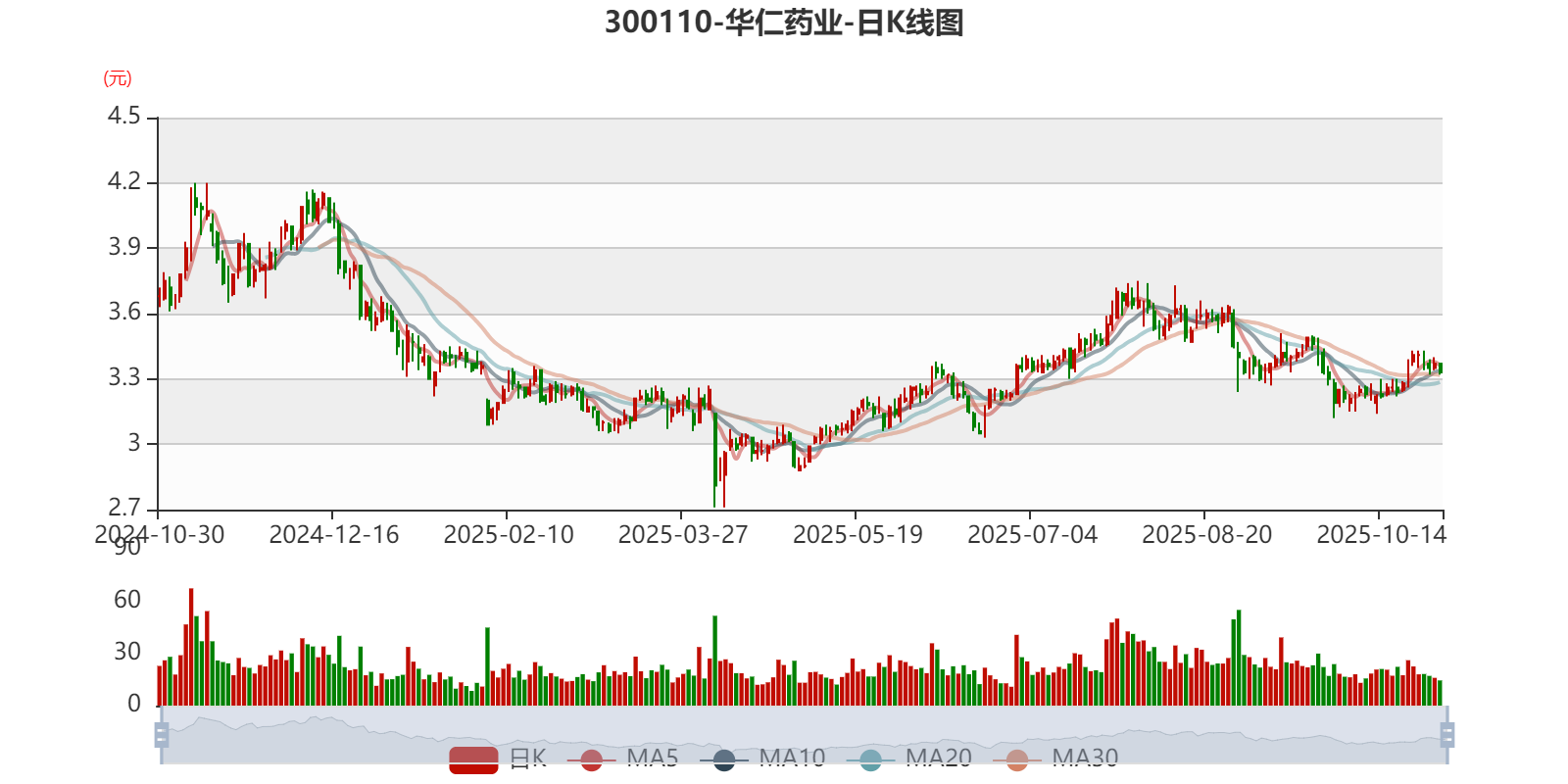 中证智能财讯华仁药业(300110)10月30日披露2025年第三季度报告。前三季度公司实现营业总收入9.76亿元,同比下降9.07%;归母净利润5457.98万元,同比下降42.87%;扣非净利润4572.72万元,同比下降49.18%;经营活动产生的现金流量净额为2.57亿元,同比下降10.08%;报告期内,华仁药业基本每股收益为0.0462元,加权平均净资产收益率为4.11%。
