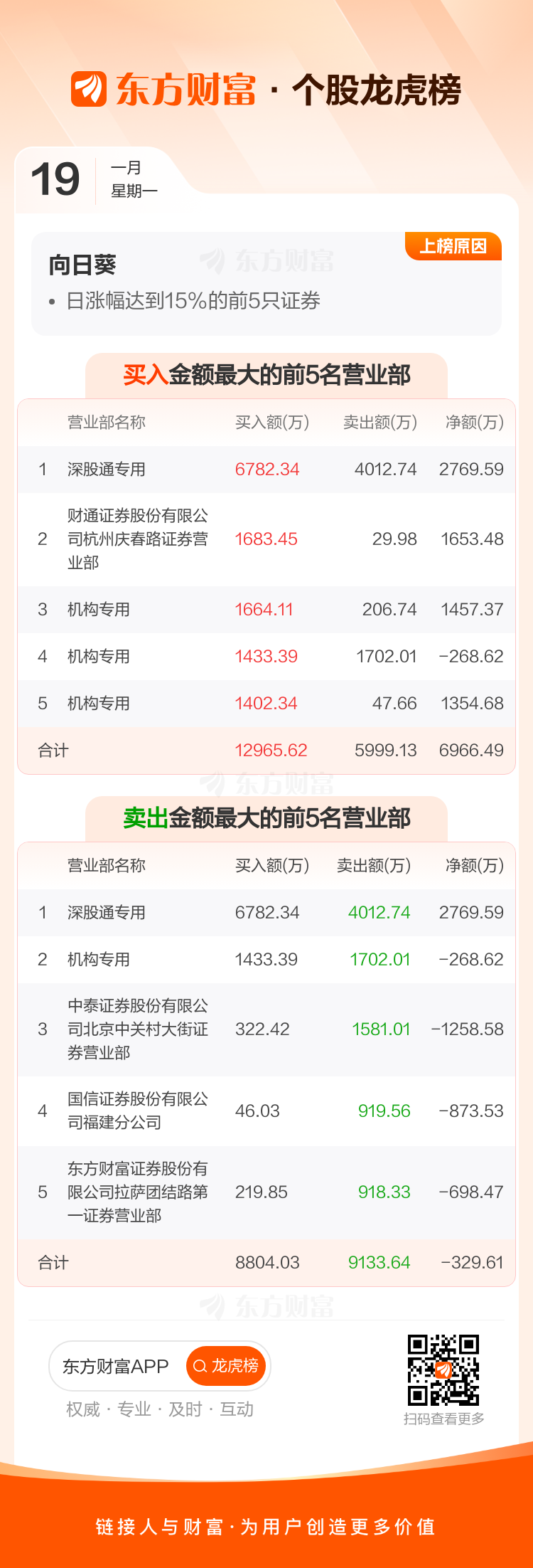 交易所2026年1月19日公布的交易公开信息显示,向日葵因成为日涨幅达到15%的前5只证券上榜。向日葵当日收报4.88元,涨跌幅19.90%,偏离值20.00%,换手率19.63%,成交额11.30亿。