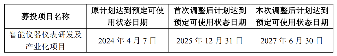 值得注意的是,本次公告延期的“智能仪器仪表研发及产业化项目”此前已经进行过一次延期,该项目原计划达到预定可使用状态日期为2024年4月7日。