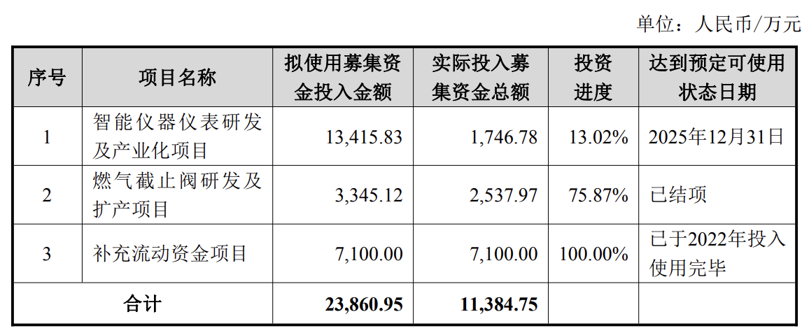 目前,“燃气截止阀研发及扩产项目”已结项,“补充流动资金项目”已于2022年投入使用完毕。而“智能仪器仪表研发及产业化项目”投资进度仅13.02%。